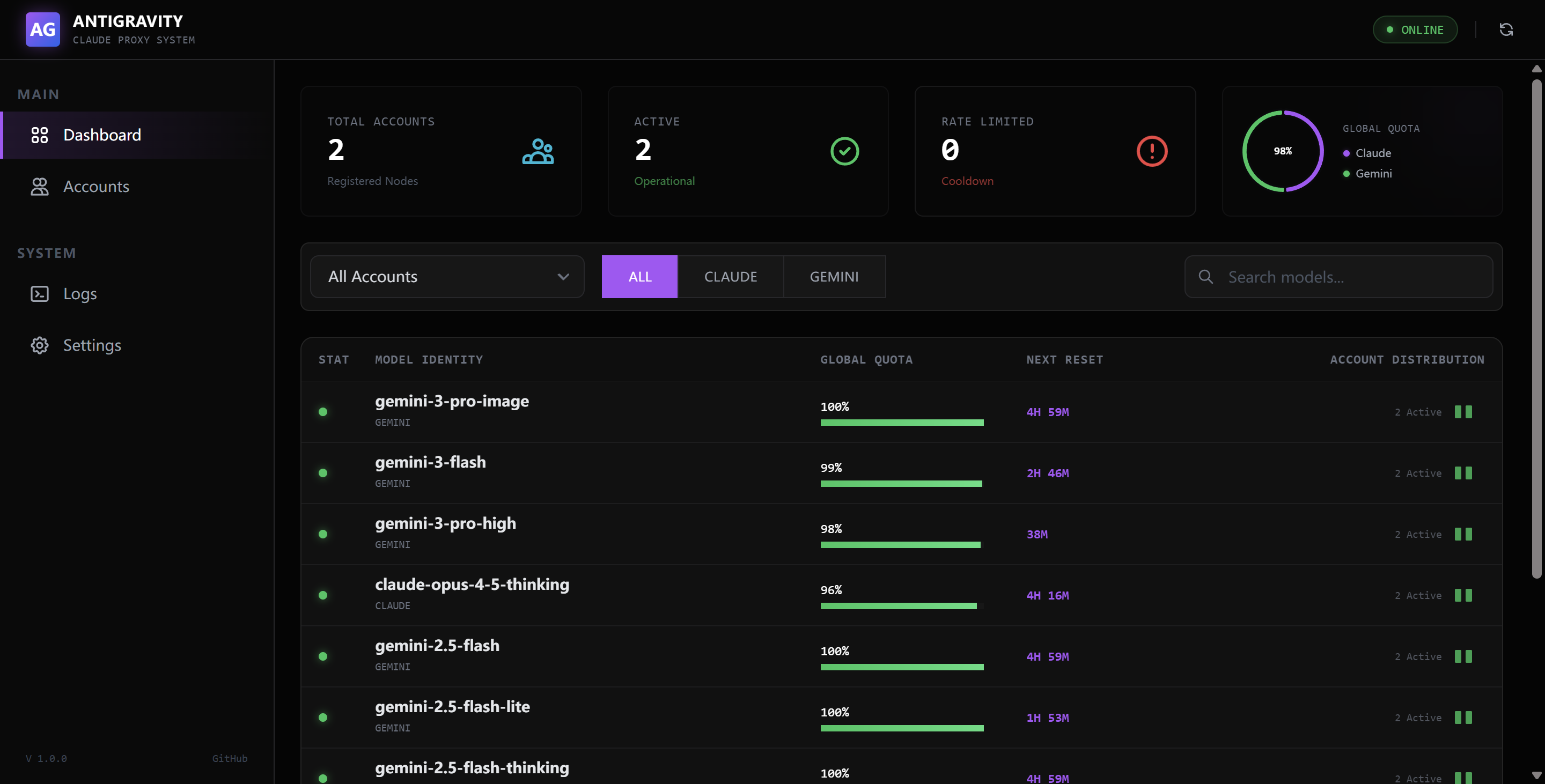 - Dashboard: Real-time model quota visualization with Chart.js